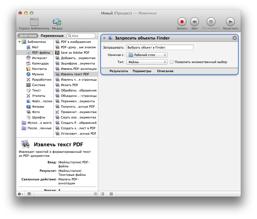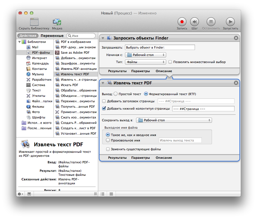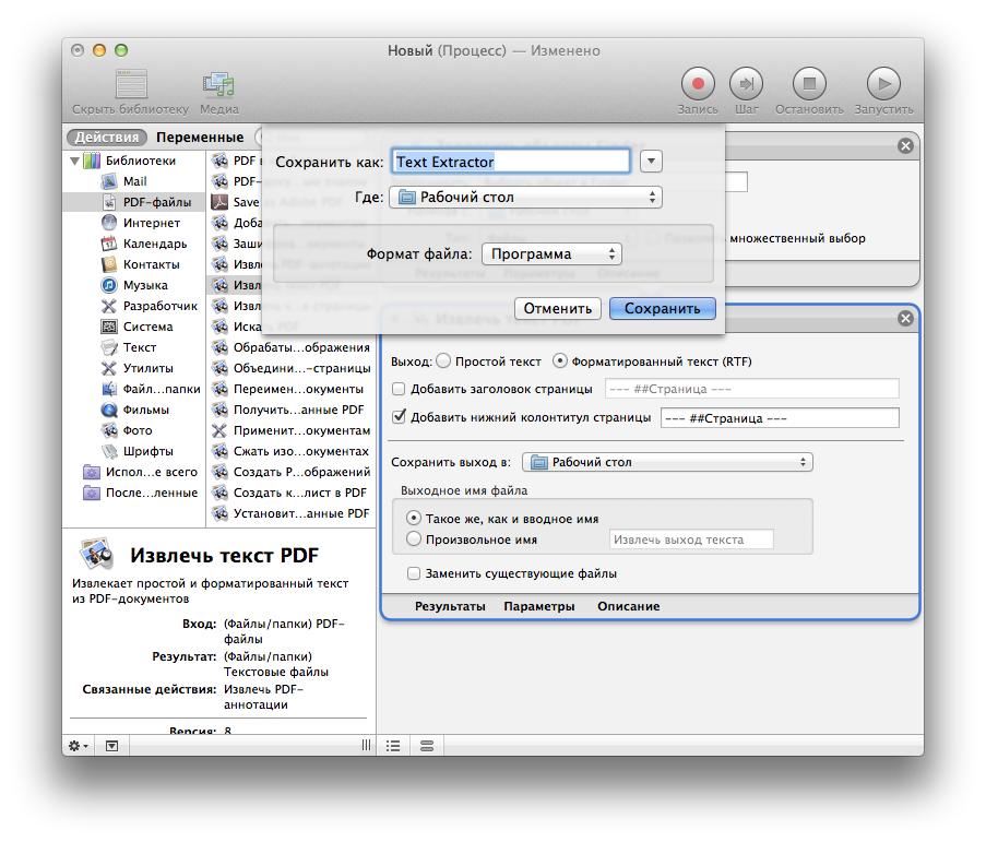 Всем привет! Мы продолжаем работу с Automator‘ом. Следующий пример, который мы разберём в этой теме — довольно простой, но удобный сценарий, позволяющий иногда сэкономить время. Он позволит вам извлечь текст из PDF-документа (естественно, в таком документе должен быть именно текст, а не сканированные картинки) и сохранить его в отдельный файл с форматированием или без оного.